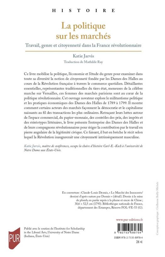 Ce livre mobilise la politique, l’économie et l’étude du genre pour examiner dans toute sa diversité la notion de citoyenneté fondée par les Dames des Halles au cours de la Révolution française à travers le commerce quotidien. Détaillantes essentielles, représentantes traditionnelles du tiers état, meneuses de la célèbre marche sur Versailles, ces femmes des marchés parisiens sont au coeur de la politique révolutionnaire. Cet ouvrage novateur explore le militantisme politique et les pratiques économiques des Dames des Halles de 1789 à 1799. Il montre comment certains acteurs des marchés façonnent la démocratie et le capitalisme naissants au fil des transactions les plus ordinaires. Retraçant leurs luttes autour de l’espace commercial, du papier-monnaie, des contrôles des prix, des impôts et des stéréotypes littéraires, le livre présente l’entreprise des Dames des Halles et de leurs compagnons révolutionnaires pour ériger la contribution par le travail en pierre angulaire de la légitimité civique. Ce faisant, il bat en brèche le récit selon lequel la Révolution inaugurerait une citoyenneté intrinsèquement masculine.