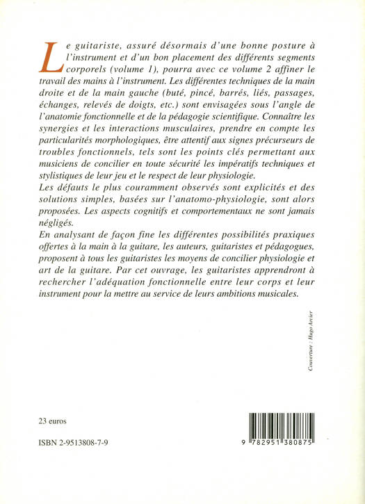 Le guitariste, assuré d’une bonne posture et d’un bon placement des différents segments corporels (volume 1), pourra avec ce volume 2 affiner le travail des mains à l’instrument. En analysant de façon fine les différentes possibilités praxiques offertes à la main à la guitare, les auteurs, guitaristes et pédagogues, proposent à tous les guitaristes les moyens de concilier physiologie et art de la guitare. Par cet ouvrage, les guitaristes apprendront à rechercher l’adéquation fonctionnelle entre leur corps et leur instrument pour la mettre au service de leurs ambitions musicales.