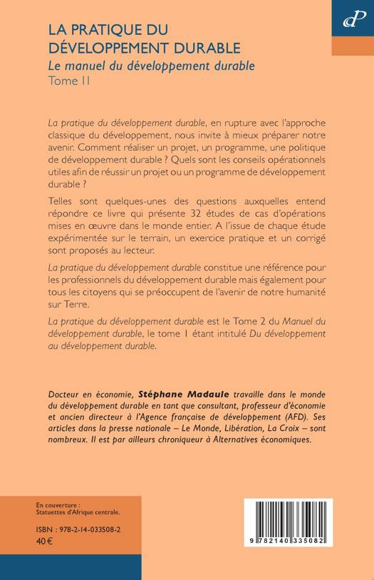 La pratique du développement durable, en rupture avec l'approche classique du développement, nous invite à mieux préparer notre avenir. Comment réaliser un projet, un programme, une politique de développement durable ? Quels sont les conseils opérationnels utiles afin de réussir un projet ou un programme de développement durable ? Telles sont quelques-unes des questions auxquelles entend répondre ce livre qui présente 32 études de cas d'opérations mises en uvre dans le monde entier. A l'issue de chaque étude expérimentée sur le terrain, un exercice pratique et un corrigé sont proposés au lecteur. La pratique du développement durable constitue une référence pour les professionnels du développement durable mais également pour tous les citoyens qui se préoccupent de l'avenir de notre humanité sur Terre.