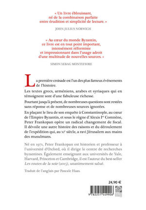 La premiere croisade est l'un des plus fameux evenements de l'histoire.Les textes grecs, armeniens, arabes et syriaques qui en temoignent sont d'une fabuleuse richesse.Pourtant jusqu'a present, de nombreuses questions sont restees sans reponse et de nombreuses sources ignorees.En placant le lieu de son enquete a Constantinople, au coeur de l'Empire Byzantin, et sous le regne d'Alexis Ier Comnene, Peter Frankopan opere un radical changement de focal. Il devoile une autre histoire des raisons et du deroulement de l'expedition qui, au XIe siecle, a ravi Jerusalem aux mains des musulmans. L'historien britannique Peter Frankopan revele dans ce passionnant recit historique, ecrit avec une grande aisance, le dessous des cartes. [...] En decentrant le regard de l'Occident a l'Orient, le texte de Frankopan est tout a fait passionnant et neuf. [...] Le melange tres reussi entre une erudition certaine et une grande facilite de lecture et d'exposition fait de ce livre une tres belle surprise, dans la veine des meilleures productions anglosaxonnes.