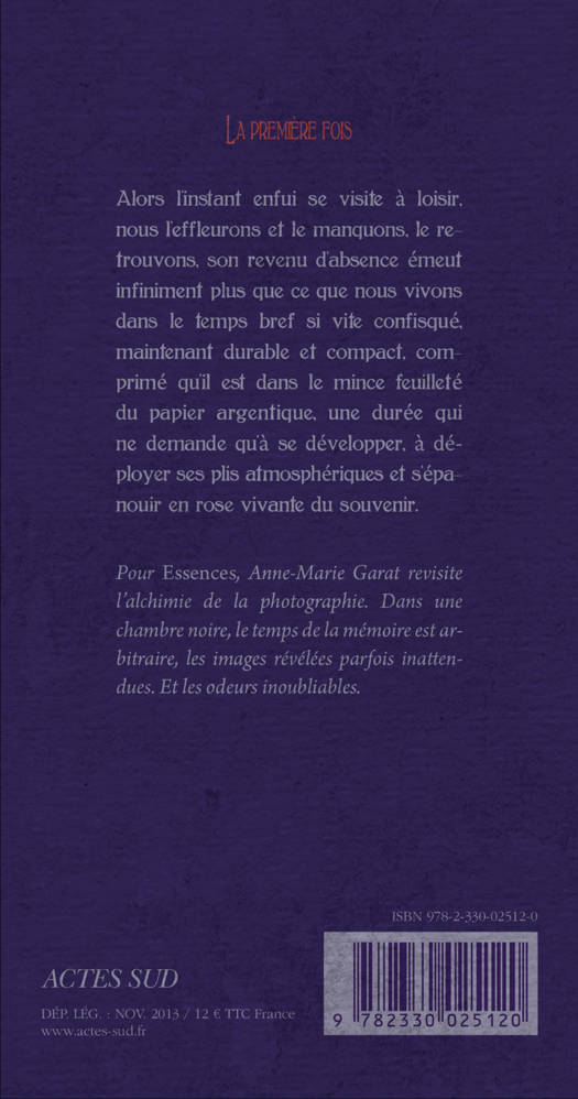 Romancière singulière, amoureuse de l'image, chez qui la mémoire passe par le cadrage, l'ombre et la lumière, Anne-Marie Garat se prête au jeu de la collection «Essences.» Les champs s'ouvrent, les réminiscences olfactives précèdent le développement de son imaginaire comme autant de solvants et autres sels d'argent au parfum entêtant qui soudain révèlent un lieu, une histoire relégués aux confins d'une mémoire oublieuse.