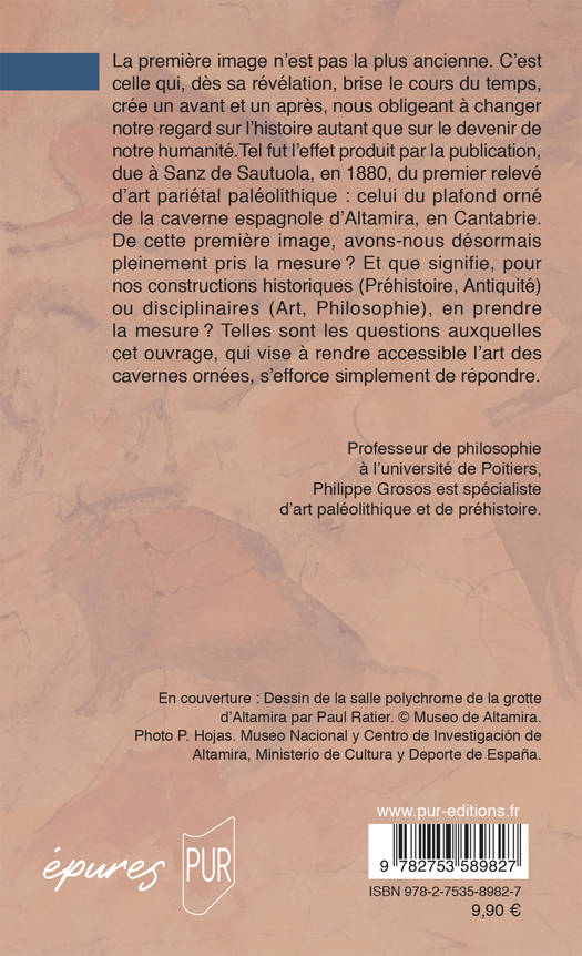 La première image n'est pas la plus ancienne. C'est celle qui, dès sa révélation, brise le cours du temps, crée un avant et un après, nous obligeant à changer notre regard sur l'histoire autant que sur le devenir de notre humanité. Tel fut l'effet produit par la publication, due à Sanz de Sautuola, en 1880, du premier relevé d'art pariétal paléolithique : celui du plafond orné de la caverne espagnole d'Altamira, en Cantabrie. De cette première image, avons-nous désormais pleinement pris la mesure ? Et que signifie, pour nos constructions historiques (Préhistoire, Antiquité) ou disciplinaires (Art, Philosophie), en prendre la mesure ? Telles sont les questions auxquelles cet ouvrage, qui vise à rendre accessible l'art des cavernes ornées, s'efforce simplement de répondre.