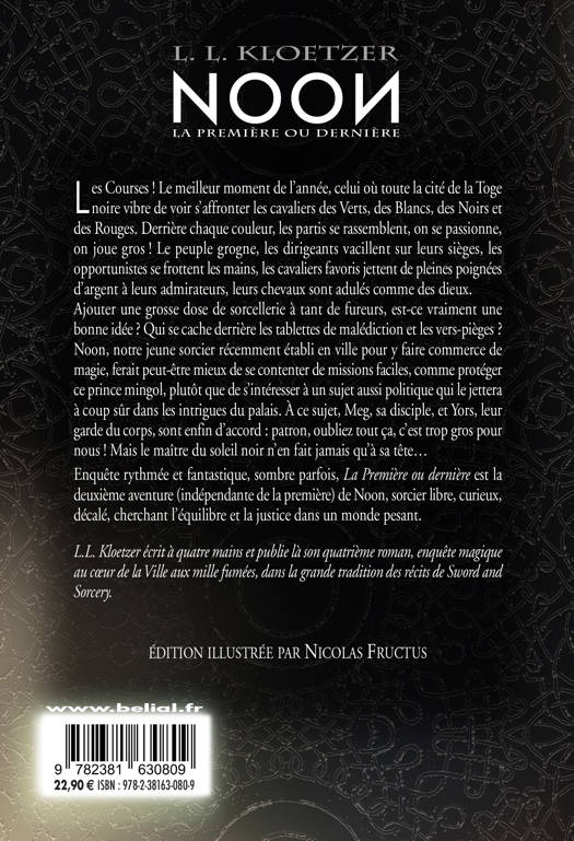 Les Courses ! Le meilleur moment de l'année, celui où toute la cité de la Toge noire vibre de voir s'affronter les cavaliers des Verts, des Blancs, des Noirs et des Rouges. Derrière chaque couleur, les partis se rassemblent, on se passionne, on joue gros ! Le peuple grogne, les dirigeants vacillent sur leurs sièges, les opportunistes se frottent les mains, les cavaliers favoris jettent de pleines poignées d'argent à leurs admirateurs, leurs chevaux sont adulés comme des dieux. Ajouter une grosse dose de sorcellerie à tant de fureurs, est-ce vraiment une bonne idée ? Qui se cache derrière les tablettes de malédiction et les vers-pièges ? Noon, notre jeune sorcier récemment établi en ville pour y faire commerce de magie, ferait peut-être mieux de se contenter de missions faciles, comme protéger ce jeune prince mingol, plutôt que de s'intéresser à un sujet aussi politique qui le jettera à coup sûr dans les intrigues du palais. À ce sujet, Meg, sa disciple, et Yors, leur garde du corps, sont enfin d'accord : patron, ne vous mêlez pas de tout ça, c'est trop gros pour nous ! Mais le maître du soleil noir n'en fait jamais qu'à sa tête...Enquête rythmée et fantastique, sombre parfois, La Première ou dernière est la deuxième aventure (indépendante de la première) de Noon, sorcier libre, curieux et décalé, cherchant l'équilibre et la justice dans un monde pesant. L.L. Kloetzer écrit à quatre mains et publie là son quatrième roman, enquête magique dans un monde fantastique, dans la grande tradition des récits de Sword and Sorcery. Édition illustrée par Nicolas Fructus