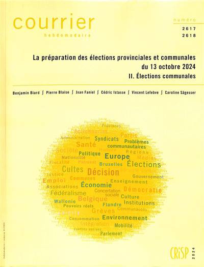 Le 13 octobre 2024 auront lieu les élections communales et provinciales. Elles mèneront au renouvellement de plusieurs centaines d’organes locaux : l’ensemble des conseils communaux et des collèges communaux (ou collèges des bourgmestre et échevins) du pays, l’ensemble des conseils provinciaux et collèges provinciaux (ou députations) de Wallonie et de Flandre, et l’ensemble des conseils et collèges de district de la commune d’Anvers. Le même jour, se déroulera également l’élection directe des conseils du CPAS dans huit communes à facilités – les autres étant renouvelés dans la foulée du scrutin communal, à l’instar d’autres institutions telles que les organes dirigeants des zones de police ou ceux des intercommunales. Ce deuxième volume du Courrier hebdomadaire consacré à la préparation de ce scrutin se concentre sur les élections communales, successivement en Wallonie francophone, en Région bruxelloise, dans les communes de la périphérie bruxelloise et de la frontière linguistique, en Flandre et en Communauté germanophone. Pour chacun de ces cinq espaces, le CRISP passe en revue la situation politique issue des élections communales du 14 octobre 2018 (en rappelant notamment le poids des partis tel qu’il apparaissait au lendemain de ce scrutin), avant de proposer une approche globale des listes de candidats déposées en vue du scrutin du 13 octobre 2024. Les commentaires des candidatures attirent l’attention sur les stratégies des partis politiques dans la confection de leurs listes : présence de personnalités en ordre utile ou non, présence de mandataires ou d’élus régionaux ou nationaux du parti en vue de bénéficier de leur notoriété, etc.