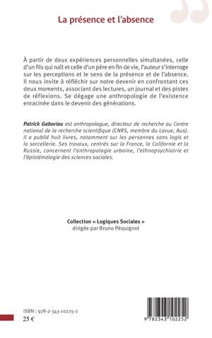 A partir de deux expériences personnelles simultanées, celle d'un fils qui naît et celle d'un père en fin de vie, l'auteur s'interroge sur les perceptions et le sens de la présence et de l'absence. Il nous invite à réfléchir sur notre devenir en confrontant ces deux moments, associant des lectures, un journal et des pistes de réflexions. Se dégage une anthropologie de l'existence enracinée dans le devenir des générations.