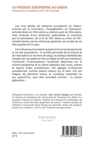 Les cinq siècles de présence européenne au Gabon, motivés par le commerce, l'évangélisation et l'éducation, activités libres du XVIe siècle au dernier quart du XIXe siècle, mais revêtues d'une dimension paternaliste et coercitive par la colonisation, de la fin du XIXe siècle au milieu du XXe, transformèrent, par les influences générées, les modes de vie des peuples de ce pays. Ces influences touchaient quasiment tous les domaines de la vie des populations: la société (primauté de la fortune et de l'éducation sur les liens de sang), la politique (hérédité des charges afin de préserver les privilèges et fortunes familiaux), l'économie (l'individualisme l'emportait désormais sur le communautarisme) et la culture (adoption des noms, parlers et façons d'être occidentaux). Cet agrégat d'influences européennes, comme partout ailleurs sur la terre, finit par intégrer les éléments locaux et constituer ensemble ce qui, aujourd'hui, peut être considéré comme la culture gabonaise.