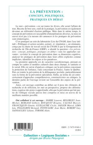 Recette de bon sens, outil de la pratique, la prévention est également devenue un référentiel d'action publique. Mais la mise en oeuvre n'est pas à la mesure des annonces et les pratiques de prévention sont réinterrogées. Il s'agit ici de : revisiter le concept de prévention dans sa dimension cognitive, analyser les pratiques de prévention dans leurs effets explicites comme implicites, identifier les enjeux et les paradoxes. Cette approche s'intéresse particulièrement aux champs du sanitaire et du social (protection de l'enfance, délinquance juvénile, éducation spécialisée).