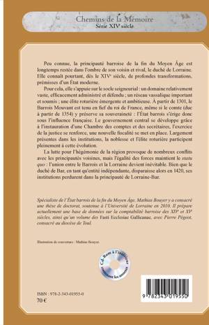 La principauté barroise de la fin du Moyen Age est longtemps restée dans l'ombre de son voisin et rival le duché de Lorraine. Elle connaît pourtant, dès le XIVe siècle, de profondes transformations, prémisses d'un Etat moderne. L'Etat barrois s'érige sous l'influence française. Le gouvernement central se développe, l'exercice de la justice se renforce, une nouvelle fiscalité se met en place. La noblesse et l'élite roturière participent pleinement à cette évolution. (Un CD contenant les annexes accompagne le livre).
