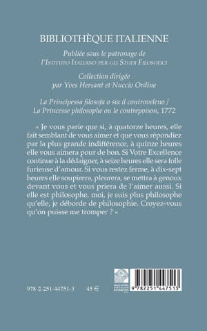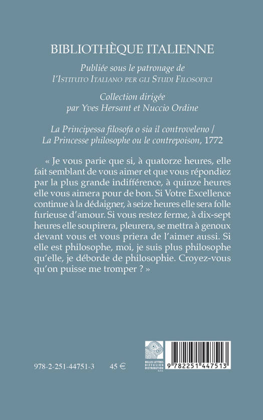 Je vous parie que si, a quatorze heures, elle fait semblant de vous aimer et que vous repondiez par la plus grande indifference, a quinze heures elle vous aimera pour de bon. Si Votre Excellence continue a la dedaigner, a seize heures elle sera folle furieuse d'amour. Si vous restez ferme, a dix-sept heures elle soupirera, pleurera, se mettra a genoux devant vous et vous priera de l'aimer aussi. Si elle est philosophe, moi, je suis plus philosophe qu'elle, je deborde de philosophie. Croyez-vous qu'on puisse me tromper ?