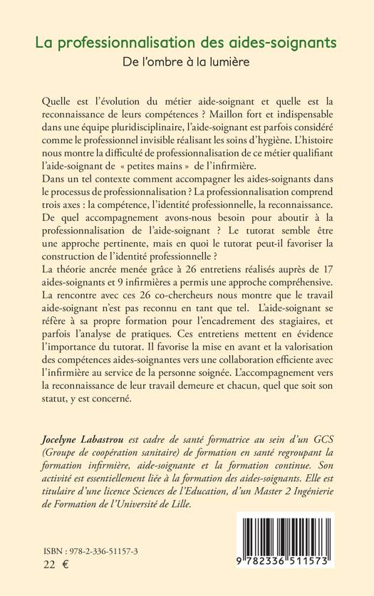 Quelle est l'évolution du métier aide-soignant et quelle est la reconnaissance de leurs compétences ? Maillon fort et indispensable dans une équipe pluridisciplinaire, l'aide-soignant est parfois considéré comme le professionnel invisible réalisant les soins d'hygiène. L'histoire nous montre la difficulté de professionnalisation de ce métier qualifiant l'aide-soignant de petites mains de l'infirmière. Dans un tel contexte comment accompagner les aides-soignants dans le processus de professionnalisation ? La professionnalisation comprend trois axes: la compétence, l'identité professionnelle, la reconnaissance. De quel accompagnement avons-nous besoin pour aboutir à la professionnalisation de l'aide-soignant ? Le tutorat semble être une approche pertinente, mais en quoi le tutorat peut-il favoriser la construction de l'identité professionnelle ? La théorie ancrée menée grâce à 26 entretiens réalisés auprès de 17 aides-soignants et 9 infirmières a permis une approche compréhensive. La rencontre avec ces 26 co-chercheurs nous montre que le travail aide-soignant n'est pas reconnu en tant que tel. L'aide-soignant se réfère à sa propre formation pour l'encadrement des stagiaires, et parfois l'analyse de pratiques. Ces entretiens mettent en évidence l'importance du tutorat. Il favorise la mise en avant et la valorisation des compétences aides-soignantes vers une collaboration efficiente avec l'infirmière au service de la personne soignée. L'accompagnement vers la reconnaissance de leur travail demeure et chacun, quel que soit son statut, y est concerné.