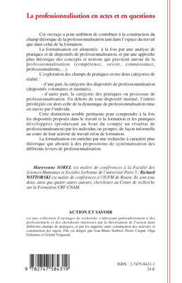 Cet ouvrage a pour vocation de préciser les questions qui se posent aujourd'hui à propos des démarches de professionnalisation, questions qui interpellent tant les chercheurs que les formateurs. Qu'en est-il de la demande de professionnalisation ? Qui en a l'initiative : les milieux professionnels, les organismes de formation, les dispositifs de certification ? Quel en est l'objet ? S'agit-il d'améliorer la professionnalisation des personnes, des organisations ? De diversifier les professions ?..