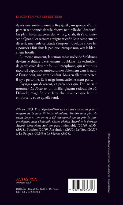 Après une soirée arrosée à Reykjavík, un groupe d'amis part en randonnée dans la réserve naturelle de Lónsöræfi. En plein hiver, au coeur des vents glacials, ils s'évanouissent. Quand les secours atteignent enfin leur campement déserté, une seule certitude s'impose : quelque chose les a poussés à fuir dans la panique, presque nus, vers la blancheur hostile. Au même moment, la station radar isolée de Stokksnes devient le théâtre d'évènements troublants. Le technicien de garde croit devenir fou - l'interphone, qui n'est plus raccordé depuis des années, sonne subitement dans la nuit. À l'autre bout, une voix d'enfant. Mais en allant inspecter, il n'y a personne. Et la neige immaculée ne ment pas... Paysages qui dévorent, et présences que l'on ne sait nommer, "La Proie" est un thriller glaçant redoutable où l'Islande, magnifique et farouche, révèle ce que la nuit emporte... et ce qu'elle rend.