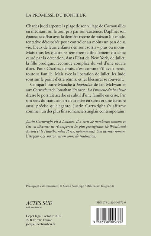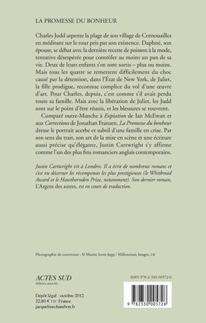 Charles Judd arpente la plage de son village de Cornouailles en méditant sur le tour pris par son existence. Daphné, son épouse, se débat avec la dernière recette de poisson à la mode, tentative désespérée pour contrôler au moins un pan de sa vie. Deux de leurs enfants s'en sont sortis - plus ou moins. Mais tous les quatre se remettent difficilement du choc causé par la détention, dans l'État de New York, de Juliet, la fille prodigue, reconnue complice du vol d'une oeuvre d'art. Pour Charles, depuis, c'est comme s'il avait perdu toute sa famille. Mais avec la libération de Juliet, les Judd sont sur le point d'être réunis, et les blessures se rouvrent. Comparé outre-Manche à «Expiation» de Ian McEwan et aux «Corrections» de Jonathan Franzen, «La Promesse du bonheur» dresse le portrait acerbe et subtil d'une famille en crise. Par son sens du trait, son art de la mise en scène et une écriture aussi précise qu'élégante, Justin Cartwright s'y affirme comme l'un des plus fins romanciers anglais contemporains.