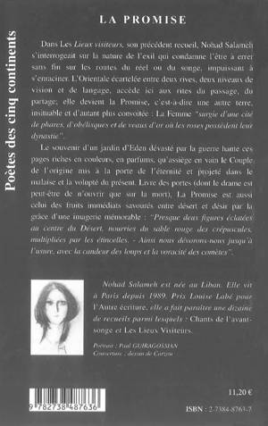 Nohad Salameh, l'Orientale écartelée entre deux rives, deux niveaux de vision et de langage, accède ici aux rites du passage, du partage ; elle devient la Promise, c'est-à-dire une autre terre, insituable et d'autant plus convoitée. Le souvenir d'un jardin d'Eden dévasté par la guerre hante ces pages riches en couleurs, en parfums, qu'assiège en vain le Couple de l'origine mis à la porte de l'éternité et projeté dans le malaise et la volupté du présent. Ivre des Portes, La Promise est aussi celui des fruits immédiats savourés entre désert et désir par la grâce d'une imagerie mémorable.