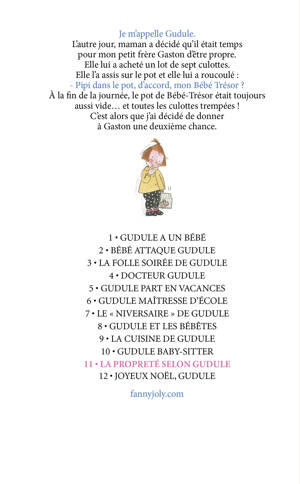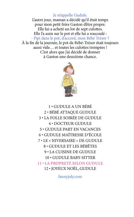 Je m’appelle Gudule. L’autre jour, maman a décidé qu’il était temps pour mon petit frère Gaston d’être propre. Elle lui a acheté un lot de sept culottes. Elle l’a assis sur le pot et elle lui a roucoulé : - Pipi dans le pot, d’accord, mon Bébé Trésor ? À la fin de la journée, le pot de Bébé-Trésor était toujours aussi vide... et toutes les culottes trempées ! C’est alors que j’ai décidé de donner à Gaston une deuxième chance.