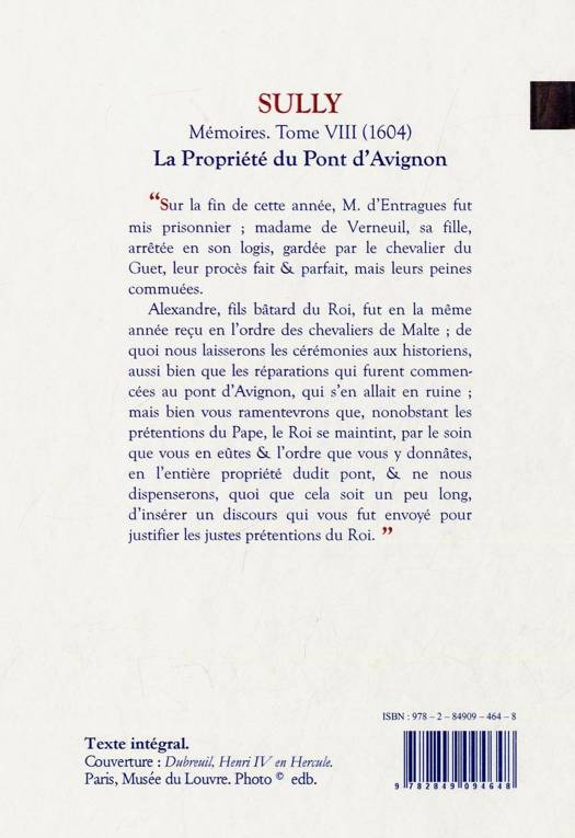 Alexandre, fils bâtard du Roi, fut en la même année reçu en l'ordre des chevaliers de Malte ; de quoi nous laisserons les cérémonies aux historiens, aussi bien que les réparations qui furent commencées au pont d'Avignon, qui s'en allait en ruine ; mais bien vous ramentevrons que, nonobstant les prétentions du Pape, le Roi se maintint, par le soin que vous en eûtes & l'ordre que vous y donnâtes, en l'entière propriété dudit pont, & ne nous dispenserons, quoi que cela soit un peu long, d'insérer un discours qui vous fut envoyé pour justifier les justes prétentions du Roi. »