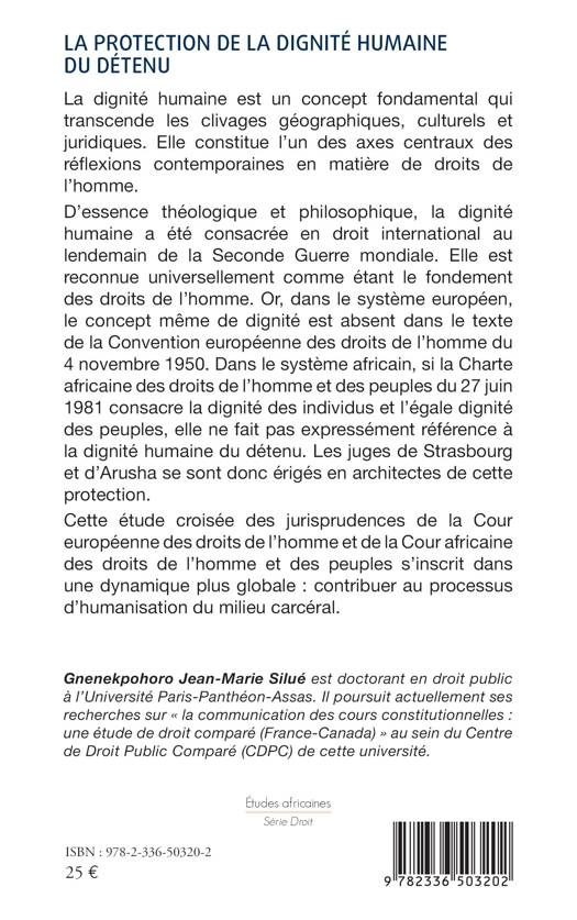 La dignité humaine est un concept fondamental qui transcende les clivages géographiques, culturels et juridiques. Elle constitue l'un des axes centraux des réflexions contemporaines en matière de droits de l'homme. D'essence théologique et philosophique, la dignité humaine a été consacrée en droit international au lendemain de la Seconde Guerre mondiale. Elle est reconnue universellement comme étant le fondement des droits de l'homme. Or, dans le système européen, le concept même de dignité est absent dans le texte de la Convention européenne des droits de l'homme du 4 novembre 1950. Dans le système africain, si la Charte africaine des droits de l'homme et des peuples du 27 juin 1981 consacre la dignité des individus et l'égale dignité des peuples, elle ne fait pas expressément référence à la dignité humaine du détenu. Les juges de Strasbourg et d'Arusha se sont donc érigés en architectes de cette protection. Cette étude croisée des jurisprudences de la Cour européenne des droits de l'homme et de la Cour africaine des droits de l'homme et des peuples s'inscrit dans une dynamique plus globale: contribuer au processus d'humanisation du milieu carcéral.