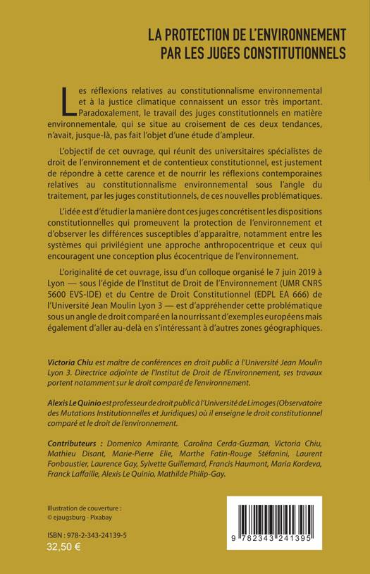Les réflexions relatives au constitutionnalisme environnemental et à la justice climatique connaissent un essor très important. Paradoxalement, le travail des juges constitutionnels en matière environnementale, qui se situe au croisement de ces deux tendances, n'avait, jusque-là, pas fait l'objet d'une étude d'ampleur. L'objectif de cet ouvrage, qui réunit des universitaires spécialistes de droit de l'environnement et de contentieux constitutionnel, est justement de répondre à cette carence et de nourrir les réflexions contemporaines relatives au constitutionnalisme environnemental sous l'angle du traitement, par les juges constitutionnels, de ces nouvelles problématiques. L'idée est d'étudier la manière dont ces juges concrétisent les dispositions constitutionnelles qui promeuvent la protection de l'environnement et d'observer les différences susceptibles d'apparaître, notamment entre les systèmes qui privilégient une approche anthropocentrique et ceux qui encouragent une conception plus écocentrique de l'environnement.