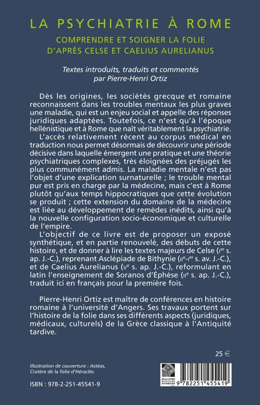 Des les origines, les societes grecque et romaine reconnaissent dans les troubles mentaux les plus graves une maladie, qui est un enjeu social et appelle des reponses juridiques adaptees. Toutefois, ce n'est qu'a l'epoque hellenistique et a Rome que nait veritablement la psychiatrie. L'acces relativement recent au corpus medical en traduction nous permet desormais de decouvrir une periode decisive dans laquelle emergent une pratique et une theorie psychiatriques complexes, tres eloignees des prejuges les plus communement admis. La maladie mentale n'est pas l'objet d'une explication surnaturelle; le trouble mental pur est pris en charge par la medecine, mais c'est a Rome plutot qu'aux temps hippocratiques que cette evolution se produit; cette extension du domaine de la medecine est liee au developpement de remedes inedits, ainsi qu'a la nouvelle configuration socio-economique et culturelle de l'empire. L'objectif de ce livre est de proposer un expose synthetique, et en partie renouvele, des debuts de cette histoire, et de donner a lire les textes majeurs de Celse (Ier s.ap. J.-C.), reprenant Asclepiade de Bithynie (IIe-Ier s. av. J.-C.), et de Caelius Aurelianus (Ve s. ap. J.-C.), reformulant en latin l'enseignement de Soranos d'Ephese (IIe s. ap. J.-C.), traduit ici en francais pour la premiere fois.