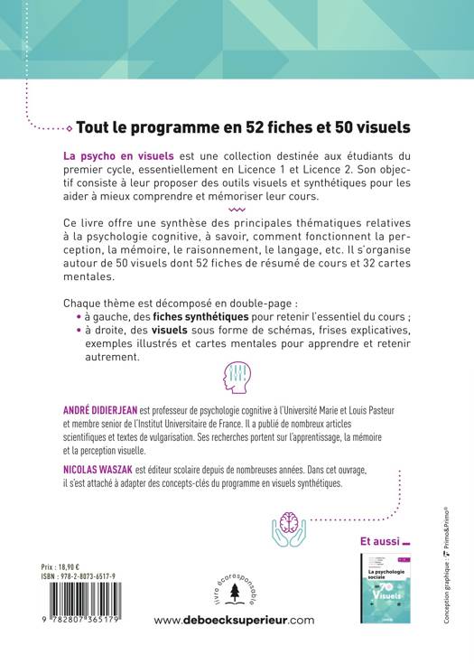 Ce livre offre une synthèse des principales thématiques relatives à la psychologie cognitive, à savoir, comment fonctionnent la perception, la mémoire, le raisonnement, le langage, etc. Il s’organise autour de 50 visuels dont 52 fiches de résumé de cours et 32 cartes mentales.
