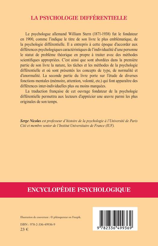 Le psychologue allemand William Stern (1871-1938) fut le fondateur en 1900, comme l'indique le titre de son livre le plus emblématique, de la psychologie différentielle. Il a entrepris à cette époque d'accorder aux différences psychologiques caractéristiques de l'individualité d'une personne le statut de problème théorique en propre à traiter avec des méthodes scientifiques appropriées. C'est ainsi que sont abordées dans la première partie de son livre la nature, les tâches et les méthodes de la psychologie différentielle et où sont présentés les concepts de type, de normalité et d'anormalité. La seconde partie du livre porte sur l'étude de diverses fonctions mentales (mémoire, attention, volonté, etc.) qui font apparaître des différences inter-individuelles plus ou moins marquées. La traduction française de cet ouvrage fondateur de la psychologie différentielle permettra aux lecteurs d'apprécier une oeuvre parmi les plus originales de son temps.