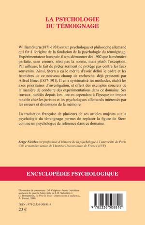 William Stern (1871-1938) est un psychologue et philosophe allemand qui fut à l'origine de la fondation de la psychologie du témoignage. Expérimentateur hors pair, il a pu démontrer dès 1902 que la mémoire parfaite, sans erreurs, n'est pas la norme, mais plutôt l'exception. Par ailleurs, le fait de prêter serment ne protège pas contre les faux souvenirs. Ainsi, Stern a eu le mérite d'avoir défini le cadre et les frontières de ce nouveau champ de recherche, déjà pressenti par Alfred Binet (1857-1911). Il en a systématisé les méthodes, établi les axes prioritaires d'investigation, et offert des exemples concrets de la manière de conduire des expérimentations dans ce domaine. Ses travaux, oubliés depuis lors, ont eu cependant à l'époque un impact notable chez les juristes et les psychologues allemands intéressés par les erreurs et distorsions de la mémoire. La traduction française de plusieurs de ses articles majeurs sur la psychologie du témoignage permet de replacer la figure de Stern comme un psychologue de référence dans ce domaine.
