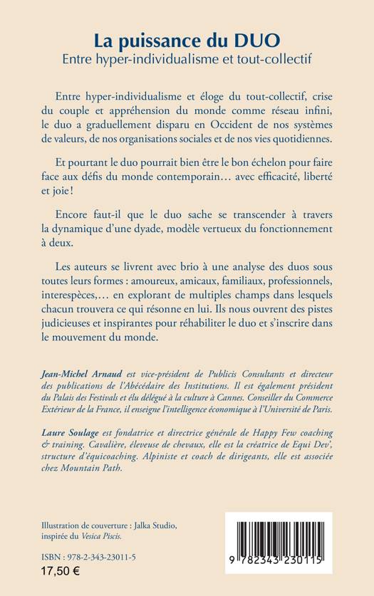 Entre hyper-individualisme et éloge du tout-collectif, crise du couple et appréhension du monde comme réseau infini, le duo a graduellement disparu en Occident de nos systèmes de valeurs. Et pourtant le duo pourrait bien être le bon échelon pour faire face aux défis du monde contemporain... Encore faut-il que le duo sache se transcender à travers la dynamique d’une dyade, modèle vertueux du fonctionnement à deux. Les auteurs se livrent à une analyse des duos sous toutes leurs formes : amoureux, amicaux, familiaux, professionnels, interespèces,... en explorant de multiples champs dans lesquels chacun trouvera ce qui résonne en lui. Ils nous ouvrent des pistes judicieuses et inspirantes pour réhabiliter le duo.