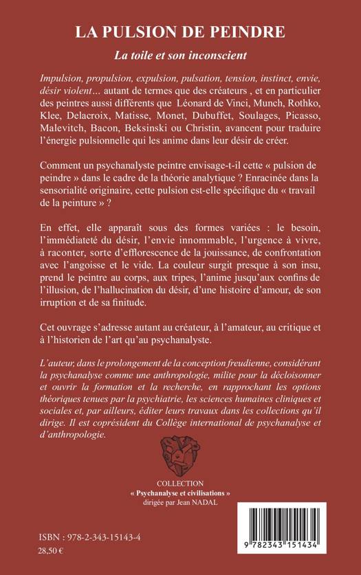 Impulsion, propulsion, expulsion, pulsation, tension, instinct, envie, désir violent autant de termes que des créateurs, et en particulier des peintres aussi différents que Léonard de Vinci, Munch, Rothko, Klee, Delacroix, Matisse, Monet, Dubuffet, Soulages, Picasso, Malevitch, Bacon, Beksinski ou Christin, avancent pour traduire l’énergie pulsionnelle qui les anime dans leur désir de créer. Comment un psychanalyste peintre envisage-t-il cette « pulsion de peindre » dans le cadre de la théorie analytique ? Cet ouvrage s’adresse autant au créateur, à l’amateur, au critique et à l’historien de l’art qu’au psychanalyste.