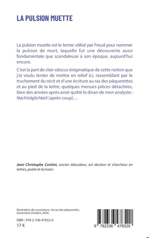 La pulsion muette est le terme utilisé par Freud pour nommer la pulsion de mort, laquelle fut une découverte aussi fondamentale que scandaleuse à son époque, aujourd’hui encore. C’est la part de clair-obscur énigmatique de cette notion que j’ai voulu tenter de mettre en relief ici, rassemblant par le truchement du récit et d’une écriture au ras des pâquerettes et au pied de la lettre, quelques menues pièces détachées, bien des années après avoir quitté le divan de mon analyste : Nachträglichkeit (après-coup)…