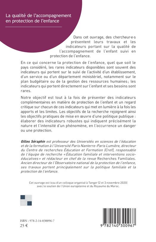 Dans cet ouvrage, des chercheur-e-s présentent leurs travaux et les indicateurs portant sur la qualité de l'accompagnement de l'enfant suivi en protection de l'enfance. En ce qui concerne la protection de l'enfance, quel que soit le pays considéré, les rares indicateurs disponibles sont souvent des indicateurs qui portent sur le suivi de l'activité d'un établissement, d'un service ou d'un département ministériel, notamment sur le plan budgétaire ou de la gestion des ressources humaines; les indicateurs qui portent directement sur l'enfant et ses besoins sont rares. Notre objectif est tout à la fois de présenter des indicateurs complémentaires en matière de protection de l'enfant et un regard critique sur chacun de ces indicateurs qui met en lumière à la fois les apports et les limites. Les objectifs de la recherche rejoignent ainsi les objectifs pratiques de mise en oeuvre d'une politique publique: élaborer des indicateurs robustes qui indiquent précisément la nature et l'intensité d'un phénomène, en l'occurrence un danger ou une protection. Gilles Séraphin est professeur des Universités en sciences de l'éducation et de la formation à l'Université Paris Nanterre-Paris Lumière, directeur du Centre de recherches Éducation et Formation (Cref), responsable de l'équipe de recherche Éducation familiale et interventions socio-éducatives et rédacteur en chef de la revue Recherches Familiales. Ancien directeur de l'Observatoire national de la protection de l'enfance, ses travaux portent principalement sur la politique familiale et la protection de l'enfance.