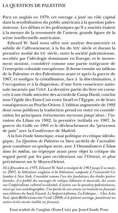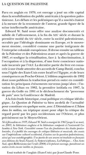 Paru en anglais en 1979, cet ouvrage a joué un rôle capital dans la sensibilisation du public américain à la question palestinienne. Les débats et les polémiques qu'il a suscités étaient à la mesure de la renommée de l'auteur, grande fi gure de la scène intellectuelle américaine. Edward W. Said nous offre une analyse documentée et subtile de l'affrontement, à la fi n du XIXe siècle et durant la première moitié du XXe siècle, entre la société palestinienne, occultée par l'idéologie dominante en Europe, et le mouvement sioniste, considéré comme une partie intégrante de l'entreprise coloniale européenne. Il dresse ensuite un tableau de la Palestine et des Palestiniens avant et après la guerre de 1967, et souligne la cristallisation, face à la discrimination, à l'occupation et à la dispersion, d'une forte conscience nationale incarnée par l'OLP. La dernière partie du livre est consacrée à une étude attentive des accords de Camp David, conclus sous l'égide des Etats-Unis entre Israël et l'Egypte, et de leurs conséquences au Proche-Orient. L'édition augmentée de 1992 dont nous publions la traduction prend en outre en considération les principaux événements survenus jusqu'alors : l'invasion du Liban en 1982, la première intifada en 1987, la guerre du Golfe en 1991 et le déclenchement du "processus de paix" avec la Conférence de Madrid. A la fois étude historique, essai politique et critique idéologique, La Question de Palestine va bien au-delà de l'actualité pour constituer en quelque sorte, avec L'Orientalisme et L'Islam dans les médias, un triptyque ayant pour objet la critique du regard porté par les pays occidentaux sur l'Orient, et plus précisément sur le Moyen-Orient.