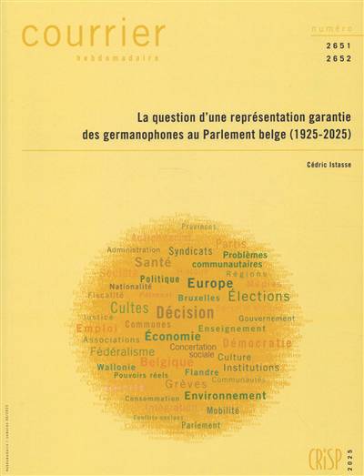 Le projet du gouvernement De Wever d’abolir le Sénat ne rencontre guère d’opposition politique en Wallonie, en Région bruxelloise et en Flandre. En revanche, en Communauté germanophone, cette perspective d’une suppression prochaine de la seconde chambre du Parlement fédéral suscite l’inquiétude de la classe politique. En effet, le Sénat est la seule instance législative fédérale dans laquelle la région de langue allemande dispose d’une représentation garantie. À l’inverse, les germanophones n’ont actuellement aucune assurance constitutionnelle ou légale de voir l’un des leurs siéger à la Chambre des représentants Le 23 juin 2025, le Parlement de la Communauté germanophone a adopté une résolution par laquelle il réclame une représentation garantie de la population germanophone à la Chambre des représentants par la création d’une circonscription électorale propre à la région de langue allemande. C’est loin d’être la première fois que l’assemblée germanophone formule une telle demande. Depuis la seconde moitié des années 1970, elle a adopté de nombreuses prises de position par lesquelles elle a plaidé en faveur d’une assurance de représentation des germanophones au sein des deux chambres législatives nationales. Ce Courrier hebdomadaire retrace cette histoire, en la faisant débuter en 1925, époque de la fixation des règles originelles quant aux modalités de la participation des habitants des communes germanophones aux élections de la Chambre des représentants et du Sénat. À titre de mise en perspective, il procède de même relativement aux élections du conseil provincial de Liège, du Parlement wallon et du Parlement européen. Une attention spécifique est réservée à la résolution du Parlement germanophone du 23 juin 2025 et à ses développements récents.