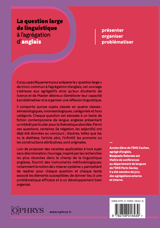 Conçu spécifiquement pour préparer la « question large » de tronc commun à l’agrégation d’anglais, cet ouvrage s’adresse aux agrégatifs ainsi qu’aux étudiants de licence et de Master désireux d’améliorer leur capacité à problématiser et à organiser une réflexion linguistique. Il comporte quinze sujets classés en quatre classes : sémasiologiques, onomasiologiques, catégoriels et hors catégorie. Chaque question est adossée à un texte de fiction contemporaine de langue anglaise présentant un intérêt particulier pour la thématique abordée. Parmi ces questions, certaines ont déjà été données au concours ; d’autres, telles que la diathèse, l’article zéro, la complémentation du nom ou les constructions attributives, sont originales. Loin de proposer des recettes applicables à tout sujet sans discrimination, l’ouvrage, inspiré par les recherches les plus récentes dans le champ de la linguistique anglaise, fournit des instruments méthodologiques, notamment la notion de « mise en système », permettant de repérer pour chaque question et chaque texte associé les éléments susceptibles de donner lieu à une problématique efficace et à un développement bien organisé.