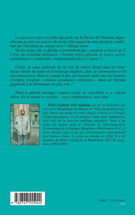 La question nègre est celle qui porte sur le Destin de l'homme négro-africain. Elle naquit du choc brutal et conflictuel de l'Occident au contact de l'Afrique noire. De nos jours, elle se décline concrètement par: comment se fait-il, qu'à l'orée du troisième millénaire, l'homme négro-africain se trouve encore globalement si vulnérable, si manipulable ? Certes, la cause profonde réside dans les nombreux siècles de traite et d'esclavage négriers et dans la colonisation. Mais n'y aurait-il pas, par hasard, certaines pesanteurs endogènes dont cet homme gagnerait à se débarrasser au plus vite ?