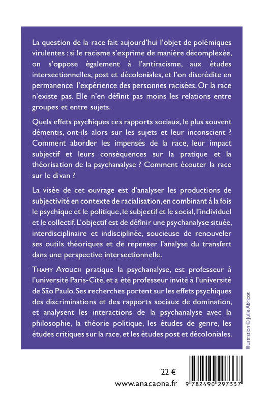 La question de la race fait aujourd'hui l'objet de polémiques virulentes : si le racisme s'exprime de manière décomplexée, on s'oppose également à l'antiracisme, aux études intersectionnelles, post et décoloniales, et l'on discrédite en permanence l'expérience des personnes racisées. Or la race n'existe pas. Elle n'en définit pas moins les relations entre groupes et entre sujets. Quels effets psychiques ces rapports sociaux, le plus souvent démentis, ont-ils alors sur les sujets et leur inconscient ? Comment aborder les impensés de la race, leur impact subjectif et leurs conséquences sur la pratique et la théorisation de la psychanalyse ? Comment écouter la race sur le divan ? La visée de cet ouvrage est d'analyser les productions de subjectivité en contexte de racialisation, en combinant à la fois le psychique et le politique, le subjectif et le social, l'individuel et le collectif. L'objectif est de définir une psychanalyse située, interdisciplinaire et indisciplinée, soucieuse de