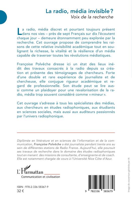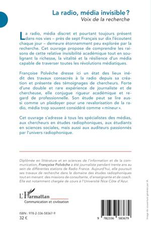 La radio, média discret et pourtant toujours présent dans nos vies - près de sept Français sur dix l'écoutent chaque jour - demeure étonnamment peu explorée par la recherche. Cet ouvrage propose de comprendre les raisons de cette relative invisibilité académique tout en soulignant la richesse, la vitalité et la résilience d'un média capable de traverser toutes les révolutions médiatiques. Françoise Polvêche dresse ici un état des lieux inédit des travaux consacrés à la radio depuis sa création et présente des témoignages de chercheurs. Forte d'une double et rare expérience de journaliste et de chercheuse, elle conjugue rigueur académique et regard de professionnelle. Son étude peut se lire aussi comme un plaidoyer pour une revalorisation de la radio, média trop souvent considéré comme mineur . Cet ouvrage s'adresse à tous les spécialistes des médias, aux chercheurs en études radiophoniques, aux étudiants en sciences sociales, mais aussi aux auditeurs passionnés par l'univers radiophonique.