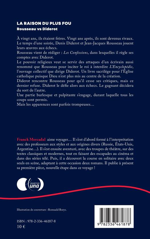 À vingt ans, ils étaient frères. Vingt ans après, ils sont devenus rivaux. Le temps d'une soirée, Denis Diderot et Jean-Jacques Rousseau jouent leurs oeuvres aux échecs. Rousseau vient de rédiger: Les Confessions, dans lesquelles il règle ses comptes avec Diderot. Le pouvoir religieux veut se servir des attaques d'un écrivain aussi renommé que Rousseau pour inciter le roi à interdire L'Encyclopédie, l'ouvrage collectif que dirige Diderot. Un livre sacrilège pour l'Église catholique puisque Dieu n'est plus mis au centre de la création. Diderot rencontre Rousseau pour qu'il cesse ses critiques, mais ce dernier refuse. Diderot le défie alors aux échecs. Le gagnant décidera du sort de l'autre. Une partie burlesque et palpitante s'engage, durant laquelle tous les coups sont permis. Mais les apparences sont parfois trompeuses...