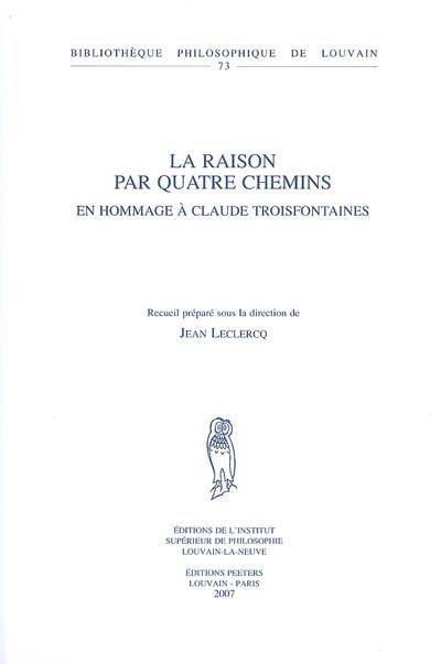 Nous publions dans ce volume les dits d'une journee d'etude en hommage de Claude Troisfontaines intitulee La Raison par quatre chemins. Apres une introduction, le lecteur trouvera une premiere figuration de ce que sont les quatre chemins de la Raison. En effet, dans son parcours academique comme dans sa vie intellectuelle, il nous semble que le travail philosophique de Claude Troisfontaines s'est deploye en quatre directions significatives: la reflexion epistemologique, les recherches en theologie naturelle ou philosophique, les etudes sur les rapports entre la philosophie et les differents arts, et les etudes blondeliennes. Dans les contributions, toutes remarquables par leur vivacite, bien que provenant d'horizons differents, les auteurs ont choisi d'emprunter un de ces quatre chemins de la Raison, en signe de compagnonnage envers Claude Troisfontaines, afin d'evoquer chacun a sa maniere une meme Histoire, vecue ou partagee. Enfin le livre contient une bibliographie complete des travaux d'edition et des publications de Claude Troisfontaines.