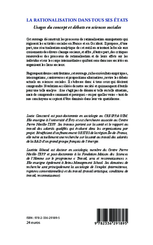 Cet ouvrage déconstruit les processus de rationalisation omnipotents qui régissent les activités sociales en France et en Occident. Il propose, d'une part, une réactualisation analytique de cet outil et offre, d'autre part, des critiques renouvelées des processus de rationalisation et de leurs effets sur les individus et sur les corps intermédiaires qui font sens dans nos sociétés en organisant les liens sociaux.