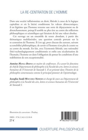 Cet ouvrage est un ensemble de textes abordant, à partir des thématiques multilatérales, une question centrale portant sur la re-centration de l'homme. Il s'est agi, pour chacun des auteurs, suivant sa sensibilité philosophique, de savoir si l'homme n'est plus le centre ou au centre du monde. En fait, avec l'économie libérale, une rationalité (bio)-technologiquement conditionnée et enfin une sécularisation de l'humain, l'homme est dans l'obligation de penser les conditions d'une redéfinition de son exceptionnalité.