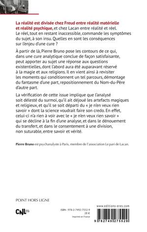 À partir de là, Pierre Bruno pose les contours de ce qui, dans une cure analytique conclue de façon satisfaisante, peut apporter au sujet une réponse aux questions existentielles, dont l'abord aura été auparavant réservé à la magie et aux religions. Il en vient ainsi à revisiter les moments qui conditionnent un tel parcours, démontage du fantasme d'une part, repositionnement du Nom-du-Père d'autre part.