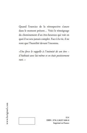 Quand l’exercice de la rétrospective s’ancre dans le moment présent… Voici le témoignage du cheminement d’un être-heureux qui voit en quoi il ne sera jamais complet. Face à la vie, il ne reste que l’humilité devant l’inconnu.