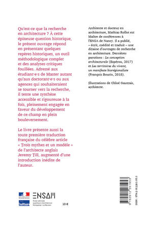 Qu’est-ce que la recherche en architecture ? À cette épineuse question historique, le présent ouvrage répond en présentant quelques repères historiques, un outil méthodologique complet et des analyses critiques fouillées. Adressé aux étudiant·e·s de Master autant qu’aux doctorant·e·s ou aux agences qui souhaiteraient se tourner vers la recherche, il tente une synthèse accessible et rigoureuse à la fois, pleinement engagée en faveur du développement de ce champ en plein bouleversement.