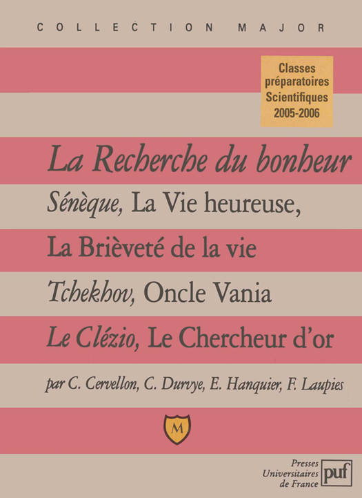 Ce manuel regroupe les oeuvres au programme des classes préparatoires scientifiques pour l'année 2005-2006 sur le thème de la recherche du bonheur. L'important est plus la recherche que le bonheur, car le bonheur n'a pas à être recherché. C'est ce que montrent les commentaires des oeuvres retenues dans ce programme . Des dissertations rédigées complètent ces analyses.