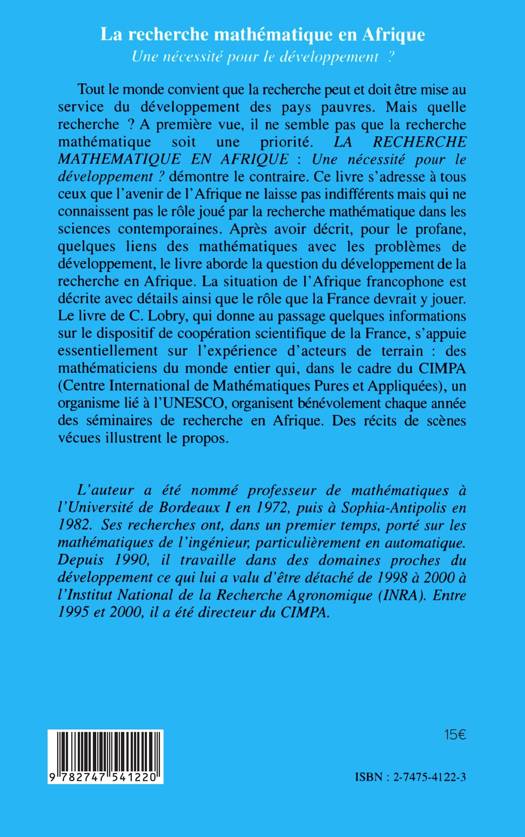 Tout le monde convient que la recherche peut et doit être mise au service du développement des pays pauvres. Mais quelle recherche ? A première vue, il ne semble pas que la recherche mathématique soit une priorité. LA RECHERCHE MATHEMATIQUE EN AFRIQUE : Une nécessité pour le développement ? démontre le contraire. Ce livre s'adresse à tous ceux que l'avenir de l'Afrique ne laisse pas indifférents mais qui ne connaissent pas le rôle joué par la recherche mathématique dans les sciences contemporaines. Après avoir décrit, pour le profane, quelques liens des mathématiques avec les problèmes de développement, le livre aborde la question du développement de la recherche en Afrique. La situation de l' Afrique francophone est décrite avec détails ainsi que le rôle que la France devrait y jouer. Le livre de C. Lobry, qui donne au passage quelques informations sur le dispositif de coopération scientifique de la France, s'appuie essentiellement sur l'expérience d'acteurs de terrain : des mathématiciens du monde entier qui, dans le cadre du CIMPA (Centre International de Mathématiques Pures et Appliquées), un organisme lié à l'UNESCO, organisent bénévolement chaque année des séminaires de recherche en Afrique. Des récits de scènes vécues illustrent le propos.
