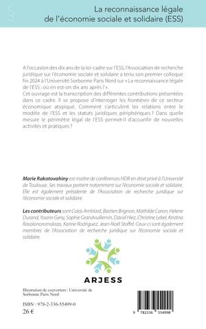 A l'occasion des dix ans de la loi-cadre sur l'ESS, l'Association de recherche juridique sur l'économie sociale et solidaire a tenu son premier colloque fin 2024 à l'Université Sorbonne Paris Nord sur La reconnaissance légale de l'ESS: où en est-on dix ans après ? . Cet ouvrage est la transcription des différentes contributions présentées dans ce cadre. Il se propose d'interroger les frontières de ce secteur économique atypique. Comment s'articulent les relations entre le modèle de l'ESS et les statuts juridiques périphériques ? Dans quelle mesure le périmètre légal de l'ESS permet-il d'accueillir de nouvelles activités et pratiques ?