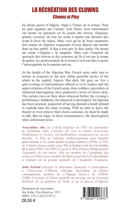 At the height of the Algerian War, French army units turn to torture in response to the new urban guerrilla tactics of the rebels in the capital, Algiers. But daily life goes on. For a gala evening of entertainment offered to civic leaders and the upper echelons of the French army, three soldiers, specialists in enhanced interrogation, have proposed a series of clown skits. The curtain rises on their dress rehearsal before the evening’s performance. Suddenly, the rehearsal is interrupted. An Algerian has been arrested, suspected of having planted a bomb primed to explode later the same evening. With no time to leave the theater or even remove their clown costumes, he must be made to talk. But on stage, in those circumstances, the interrogation takes unfores