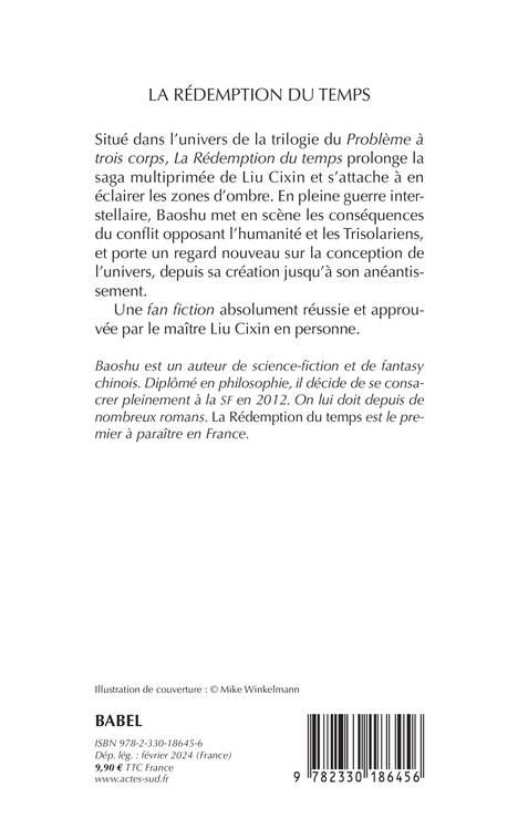 Situé dans l'univers de la trilogie du "Problème à trois corps", "La Rédemption du temps" prolonge la saga multiprimée de Liu Cixin et s'attache à en éclairer les zones d'ombre. En pleine guerre interstellaire, Baoshu met en scène les conséquences du con it opposant l'humanité et les Trisolariens, et porte un regard nouveau sur la conception de l'univers, depuis sa création jusqu'à son anéantissement. Une fan fiction absolument réussie et approuvée par le maître Liu Cixin en personne.