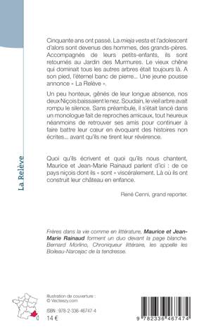 Cinquante ans ont passé. La mieja vesta et l’adolescent d’alors sont devenus des hommes, des grands-pères. Accompagnés de leurs petits-enfants, ils sont retournés au Jardin des Murmures. Le vieux chêne qui dominait tous les autres arbres était toujours là. A son pied, l’éternel banc de pierre... Une jeune pousse annonce « La Relève ». Un peu honteux, gênés de leur longue absence, nos deux Niçois baissaient le nez. Soudain, le vieil arbre avait rompu le silence. Sans préambule, il s’était lancé dans un monologue fait de reproches amicaux, tout heureux néanmoins de retrouver ses amis pour continuer à faire battre leur cœur en évoquant des histoires non écrites... avant qu’ils ne tirent leur révérence.