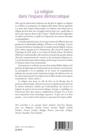 Les études présentées dans cet ouvrage invitent à une réflexion dans une perspective de philosophie politique, d'histoire ou de théologie et à s'interroger sur les relations entre démocratie et religion dans l'espace démocratique. Les analyses portent principalement sur le contexte contemporain et européen des cultures marquées par le christianisme, et s'ouvrent vers l'Amérique du XIX e siècle et vers l'islam du Proche-Orient.
